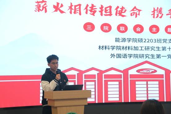 (通讯员 施君儒 陈嘉昕 黄淇)2023年4月25日晚,能源学院硕2203班党支部、437ccm必赢国际首页欢迎您材料加工研究生第十一党支部和外国语学院研究生第一党支部在清洁能源大楼一楼N102会议室联合举办以多领域科研故事互学互鉴为主题的4月主题党日活动。本次活动以“薪火相传担使命,携手奋发谱新篇”为主题,分享各个学院的科研故事,进行多领域科研的交流互鉴。