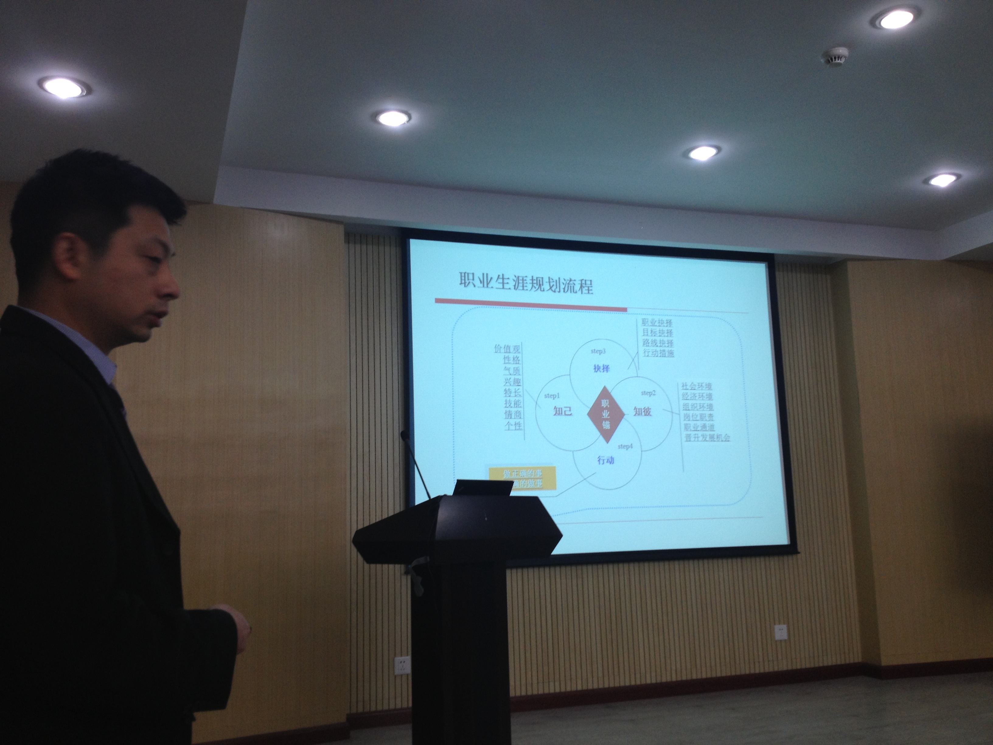 廖经理首先提出职业定位与职业目标的重要性,在此阶段,要做到知己知彼,才能做出正确的抉择,采取正确的行动。“知己”即要明确自己的职业兴趣、性格、特长与技能以及核心价值观;“知彼”则是确定自己就业的组织类型,偏好外资、国企、民企还是政府机构,了解地区的经济发展状况和自然社会环境等,以及具体的职位要求与特点。了解了这些之后,才能明确目标,给自己正确的职业定位,并掌握所需知识技能,积累经验,为以后的就业做好准备。
